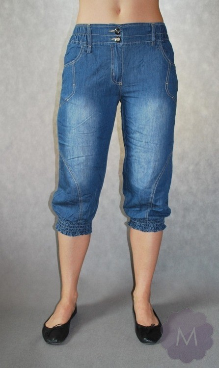 - Niebieskie krótkie spodenki damskie jeansowe rybaczki. Spodnie mają podwyższony stan. Spodnie zapinane na dwa guziki, pas oraz nogawka na dole na ściągaczu. Dostępne rozmiary od S-XL.