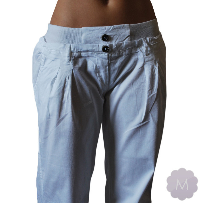 • Białe krótkie spodenki alladynki z kieszeniami. Spodnie posiadają ściągacz w pasie, dodatkowo zdobiony dwoma guzikami, nogawka na dole również na ściągaczu.